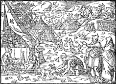 Description: God provides the Israelites with food by sending them quail. Illustration by Pierre Eskrich (ca. 1550-ca. 1590).