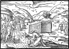 Description: An omer of manna is gathered to be placed in the tabernacle. Illustration by Pierre Eskrich (ca. 1550-ca. 1590).