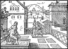 Description: As David looks down from a palace balcony, Bathsheba bathes in a pool, accompanied by her attendants. Illustration by Pierre Eskrich (ca. 1550-ca. 1590).