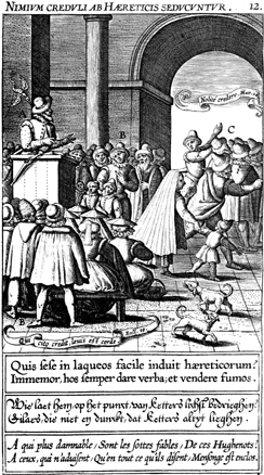 Description: A heretic, identified by the devil whispering in his ear, preaches from a pulpit. Some receive his message credulously and others flee, refusing to believe. The Latin superscription reads, "Those who are too credulous are seduced by heretics," and the text below "Who puts himself easily into the noose of the heretics? The needless, to these they always to give words and sell smoke." (N.B. the French translation reads "Hughenots" for "heretics.") The banners across the image run, "Do not believe Matt 27" (Matthew 24:23) and "He that is hasty to give credit is light of heart Eccli 19" (Ecclesiasticus 19:4)..
