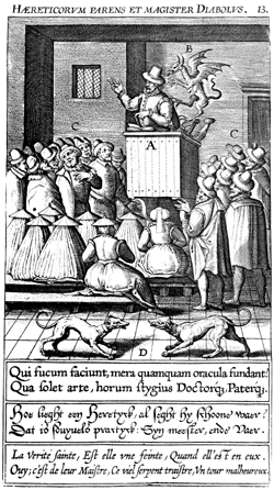 Description: A heretic, again identified by a demon whispering in his ear, addresses an eager congregation. In the foreground, a pair of dogs fight. The Latin superscription reads, "The Devil, the parent and master of heretics" and the text below, "How do they create a sham, although they pour forth genuine prophecies? By the customary trickery of their Stygian Doctor and Father.".
