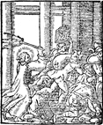 Description: Jesus cleanses the temple by driving out all those who were buying and selling there. Illustration by Pierre Eskrich (ca. 1550-ca. 1590).