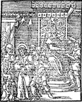 Description: The Jews ask for Barabbas to be freed rather than Jesus. Believing that he is innocent, Pilate symbolically washes his hands before handing Jesus over to the Jews. Illustration by Pierre Eskrich (ca. 1550-ca. 1590).