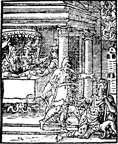 Description: Lazarus sits at the gate of the rich man, who lives in luxury. In the rear, the rich man begs Abraham to allow Lazarus to put water on his tongue to quench his torment. Illustration by Pierre Eskrich (ca. 1550-ca. 1590).