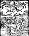 Description: The angels gather the harvest at the end of the age, as God looks on with pruning hook in hand. Illustration by Pierre Eskrich (ca. 1550-ca. 1590).