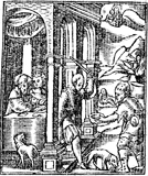 Description: Lazarus sits at the gate of the rich man, who lives in luxury. In the rear, the rich man begs Abraham to allow Lazarus to put water on his tongue to quench his torment.