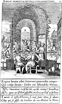Description: The image portrays sin as animalistic, juxtaposing sinful indulgences, including a sumptuous feast, with the image of a demon riding a human being like a beast of burden. The Latin superscription runs, "It is the height of insanity to commit sin," and the text below, "Thus brutishness indeed stands in the breast of anyone who serves vice: splendid virtue seems unworthy to him.".