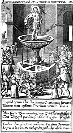 Description: Jesus stands with cross in hand atop a large fountain, blood pouring forth from his wounded side, which is distributed through the fountain to seven triangular compartments, each bearing a scene of one of the sacraments. The Latin superscription reads, "The institution of the salvific seven sacraments," and the text below, "How much power do the holy gifts have to keep us in Christ? Power not of ourselves buys the reward of health.".