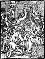 Description: Jesus is mocked by the soldiers before his crucifixion, as he sits on a make-shift throne wearing a crown of thorns.