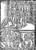 Description: Pilate presents Jesus to the crowd, arrayed with a crown of thorns and a reed scepter.