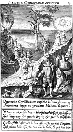 Description: In the foreground, a man confers sheds his ragged clothes as he confers with a serpent. Behind him three people worship the sun and stars. To their left, a man prunes dead branches from a large tree. To his left, people walk up a ramp only to fall into the mouth of hell. In the center, a man ponders the scene. The Latin superscription reads, "The duty of the just Christian," and the text below, "In what way will I fill up Christendom with justice and good? Flee what is worse: and prudently follow what is better.".