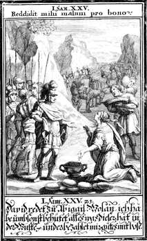 Description: Abigail brings David and his soldiers gifts in order to atone for her husband Nabal’s insults.