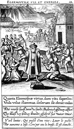 Description: A central figure distributes money while others to his left and right distribute food to a variety of needy people, including the crippled, widows, and orphans. Behind them, a group uses buckets of water to douse a burning house and in the background, people drown off the bow of Noah's ark. The Latin superscription reads, "The power and energy of almsgiving," and the text below, "How great is the power of almsgiving, as long as life lasts? A wave like flames, thus it covers over the waves of wickedness.".