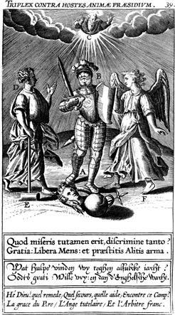 Description: A soldier, an angel, and a man with a winged hammer stand around a severed head and an org, encircled by a serpent, while God looks on from the clouds above. The Latin superscription reads, ""Threefold guardian of the soul against enemies" and the text below, "What safeguard will there be in misery, in such a crisis? Grace: free mind: even excelling winged arms.".