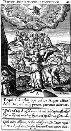 Description: An angel stands in the center of the image, in front of a depiction of Jesus delivering the sermon on the mount, above which God sits surrounded by angels. Four scenes from Tobit surround the central angel. Counter-clockwise from right they are: Tobit burying the dead, killing a fish, meeting an angel along the road, and praying. The Latin superscription reads, "The threefold protective duty of angels" and the text below, "How many other winged guards stand by to help us? Urged on by God, and our prayers, a patron watches".
