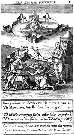 Description: A depiction of memory, intellect, and will as the three influences on life The Latin superscription reads, "Three powers of the soul," and the text below, "The three-fold powers of the soul, stretched out in heavenly service. Memory; intellect; one's own will.".