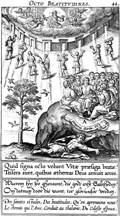 Description: Jesus teaches his disciples the beatitudes as a representation of each approaches the temple of God in the background. The Latin superscription reads, "Eight Beatitudes, " and the text below, "What do the eight prophetic signs indicate about the blessed life? They are tokens by which God signifies the heavenly city.".