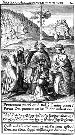 Description: A kneeling child receives a crown from each of three female figures. Behind them, a tree grows, lashed to a pole for strength, workers prune a vineyard and a man pours wine into a large jug. The Latin superscription reads, "Three rare ornaments of the young," and the text below, "What cloak is the most attractive adornment of a child? That he obey; that he press on in prayer; that he imbue his prayer with modest chastity.".
