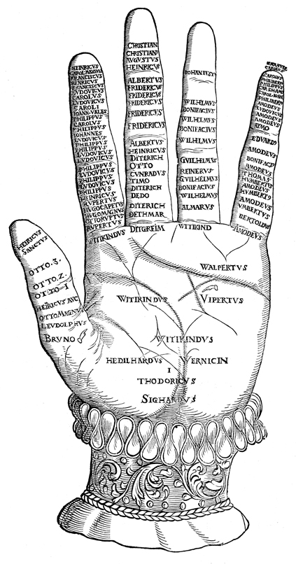 Description: A left hand is inscribed with the family tree of the House of Saxony, and the name of progenitor King Sigurd (c. 636–690) appears at the base. The different fingers correspond to the different royal lines. From left to right, thumb to pinky, these lines are: the Ottonian dynasty, which ends with Holy Roman Emperor Henry II (r. 1014–24); French monarchs, up to Henry III (r. 1574–89); the House of Wettin, up to Christian II (r. 1591–1611); the Aleramici dynasty of Montferrat, which ended with John I (r. 1292–1305); and finally, the rulers of Savoy, up to Charles Emmanuel I (r. 1580–1630).