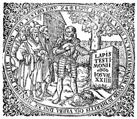 Description: The printer’s device of Hans Steinmann consists of the Latin motto LAPIS ISTE ERIT VORIS IN TESTIMO NIUM QUOD AU DIERITIS (“-this stone shall be a witness against us, for you have heard all the words of the LORD), the Latin version of Joshua 24:27.