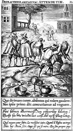 Description: Two men gossip about a third man, whose back is turned, while nearby a man steals a coat from another and in the background, a crippled beggar points to another in scorn. In the foreground, there is a pot, a mirror, and a kettle, with a banner that reads, "Woe to you: you say "black" but you are as dark as the pot." The Latin superscription reads "The power to ward off slander: pay attention to yourself," and the text below, "By what wedge might I separate (myself) from the empty who peck away at joy? First, say, I might agitate we ourselves to a finger nail (exact measure).".