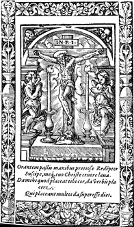 Description: A rendering of the Crucifixion as an altar cross. Two candles rest on the altar, and two angels stand by the sides. Below the image is written, “Praying with outstretched hands, the precious Redeemer ….” Above the cross are the initials INRI, which stand for Jesus of Nazareth, King of the Jews.
