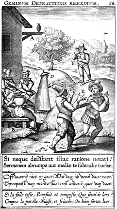 Description: Two men argue near a group of quarrelling women; a man holds a cup in the background. The Latin superscription reads, "The twin remedies for slander," and the text below, "What if the ones who do not observe prudence in this way will not desist? Break off conversation: or carry yourself off from the middle of the uproar.".
