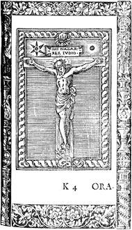Description: Jesus hangs on the cross. At the top of the cross is written IHS NAZAR REX IVDIO, meaning Jesus of Nazareth, King of the Jews.