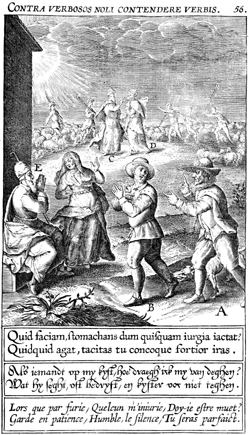 Description: A man walks away from an adversary, who pursues him and a dog tugs at his pant leg, beside an arguing woman and man; a flock is scattered while the shepherds fight; while in a parallel scene, a flock is safe as the shepherds work together. The Latin superscription reads, "Do not contend against words with words," and the text below, "What should I do, boiling over with anger while someone hurls abuse? Whatever he might do, tolerate it with silence stronger than wrath.".