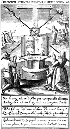 Description: Four people kneel in front of a cross, which bears a flail and crown of thorns; at its base is an altar where an open book displays Christ wearing a crown of thorns on one page and the wounds of his crucifixion on the other. The Latin superscription reads, "The suffering Christ, the perfect exemplar of patience" and the text below, "Not to be subdued by an adversary, through what summary might I learn? Read this book, of the flail, cross, blood of Christ.".