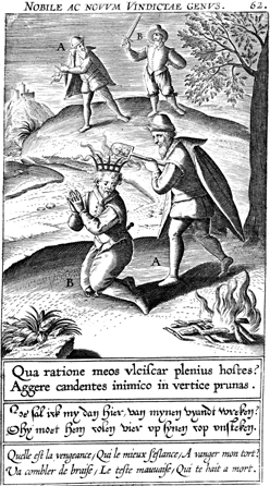 Description: A man heaps coals into a basket on the head of a kneeling man; a man flees from an approaching swordsman in the background. The Latin superscription reads "" and the text below, "In what way might I punish my enemies generously? Heap glowing coals onto the head of your adversary.".