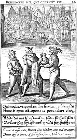 Description: Loaves of bread and jugs of wine are distributed to a group of soldiers in the background, while in the foreground a man gives a jug and a loaf to a single man. The Latin superscription reads, "Do good to those who hate you," and the text below, "How is it possible, that what you say is without iron and yet causes pain? Cover it up, if necessary, and also offer consolation with food and drink.".