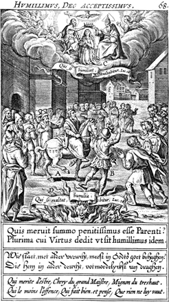 Description: A man on horseback is acclaimed by a crowd and a banner beneath him reads "Whoever exalts himself will be humbled, Luc. 14 (Luke 14:11);" overhead Mary is crowned over a banner that reads "Whoever humbles himself will be exalted, Luc. 14 (Luke 14:11)." The Latin superscription reads, "The most humble is most acceptable to God," and the text below, "Who most completely deserves to be on high with God? The one to whom innumerable hosts give the same will be humble.".