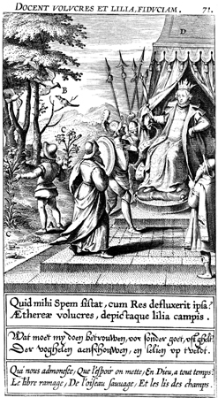 Description: Solomon is seated on a throne, among his court; a man admires the beauties of nature. The Latin superscription reads, "The birds and lilies teach faith," and the text below, "What inspires hope in me, when the very thing has slipped away? Consider the birds of the air and the lilies of the field".