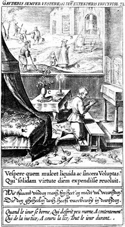 Description: A man kneels in prayer before an altar in a bedroom decorated with flowers; people go to church and give alms to the poor in the background. The Latin superscription reads, "You will alwayhs rejoice in the evening; if the day was spent fruitfully," and the text below, "In the evening, who is soothed by clean and pure pleasure? Whoever remembers that he spent the whole day in virtue.".
