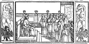 Description: This engraving illustrates the visit of a Roman bishop to a parish church. While visiting, he gives the local congregation a solemn blessing and, during the liturgy, tells them the reasons why he has come to see them (e.g., to ascertain whether or not the local church is being well governed, to perform the sacrament of confirmation, and so on). The image in flanked by a border containing angels, or putti, standing over eagles and holding snakes.