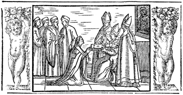 Description: This engraving illustrates the consecration of a new bishop. The bishop-elect, with his hands bound within a long linen cloth, kneels before the presiding bishop. The latter offers the book of the Gospels to the bishop-elect and commissions him to preach. The image is flanked by a border containing angels, or putti, holding flowers.