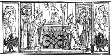 Description: This engraving illustrates the consecration of a new bishop. The newly consecrated bishop, wearing his miter and holding his staff, kneels before the presiding bishop, who blesses him again. The image is flanked by a border containing angels, or putti, standing over eagles and holding snakes.