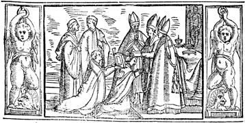 Description: This engraving illustrates the consecration of a new bishop. The bishop-elect kneels before the chief consecrating bishop, as he and his assistant bishops place the book of the Gospels on the bishop-elect’s shoulders. The image is flanked by a border containing angels, or putti, suspended over the heads of soldiers.