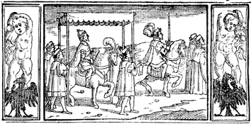 Description: This engraving illustrates a ruler traveling with his entourage. The image is flanked by a border containing angels, or putti, standing over eagles and holding snakes.