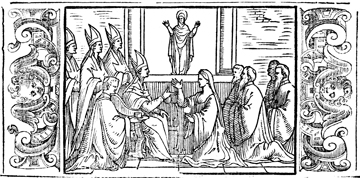 Description: This engraving illustrates the blessing and coronation of a queen consort. The queen kneels before the metropolitan bishop while he anoints her hands and arms with the oil of catechumens. The image is flanked by a border containing angels, or putti.