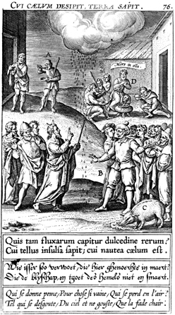 Description: Moses addresses a group, while manna pours from a cloud overhead and a pig attacks a snake; in the background, a man eats from a bowl and a group of men eat from a pot with a skeleton in it, under a banner that reads, "in this pot, death." The Latin superscription reads, "He who thinks heaven is foolish, has the taste of the earth," and the text below, "Who is captured by the sweetness of so many transient things? To him the earth seems dull; to him heaven is the sea".
