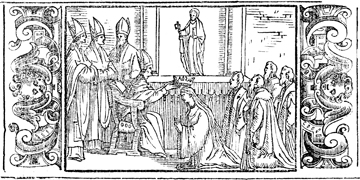 Description: This engraving illustrates the blessing and coronation of a queen. The queen-elect kneels in front of the metropolitan bishop and receives her crown. A group of noblemen and priests look on. The image is flanked by a border containing angels, or putti.