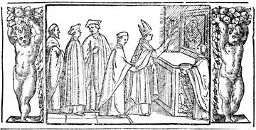 Description: This engraving illustrates the dedication or consecration of a church. The bishop blesses the new altar by sprinkling it with holy water taken from an aspersorium (a basin used to contain holy water) using a hyssop branch as an aspergillum (instrument used for sprinkling holy water). The image is flanked by a border containing angels, or putti, holding flowers.
