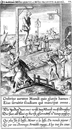 Description: A man hangs from a gallows, while a woman with a crown and an orb on her head flees and women drive out a young man with brooms and sticks; a man in a boat, a man selling his wares to a crowd and a beggar tripping are visible in the background. The Latin superscription reads, "Who most serves the world is most cheated by it," and the text below, "Who repeatedly swallows the gilded hook of the world? Who sells all of his zeal to servitude.".