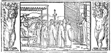 Description: The Pope blesses those he meets on the road. The image is flanked by a border containing angels, or putti, holding flowers.