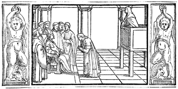 Description: The bishop sits among the priests of the diocese, as the archdeacon stands in a pulpit and reads the profession of faith. All who are present also make the profession of faith. The image is flanked by a border containing angels, or putti, suspended over the heads of soldiers.