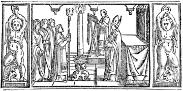 Description: On Holy Saturday, a deacon lights one candle from three and sings, “Lumen Christi” (“the light of Christ”), to which all reply,”Deo gratis” (“thanks be to God”). The image is flanked by a border containing angels, or putti, suspended over the heads of soldiers.