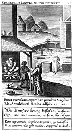 Description: A man works at a potter's wheel as two people watch and a woman enters a cemetery. The Latin superscription reads, "The lesson of the cemetery: contempt for the world," and the text below, "According to what Stoic teacher should I be able to grasp this paradox? See, gaze on the funeral plain of the graveyard".