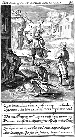 Description: A man approaches a house, carrying a shovel, while a skeleton wearing a cloak threatens him from behind with a spear and others look on; a group of men have a meal at the top of a butte, while one of them falls off; a man shoots an arrow into the air and another man walks with a walking stick in the background. The Latin superscription reads, "Do this, that you might wish to have been driven into death," and the text below, "What better things, while I live, to you urge [me] to grasp? Reject those things death will extract in your final hour.".